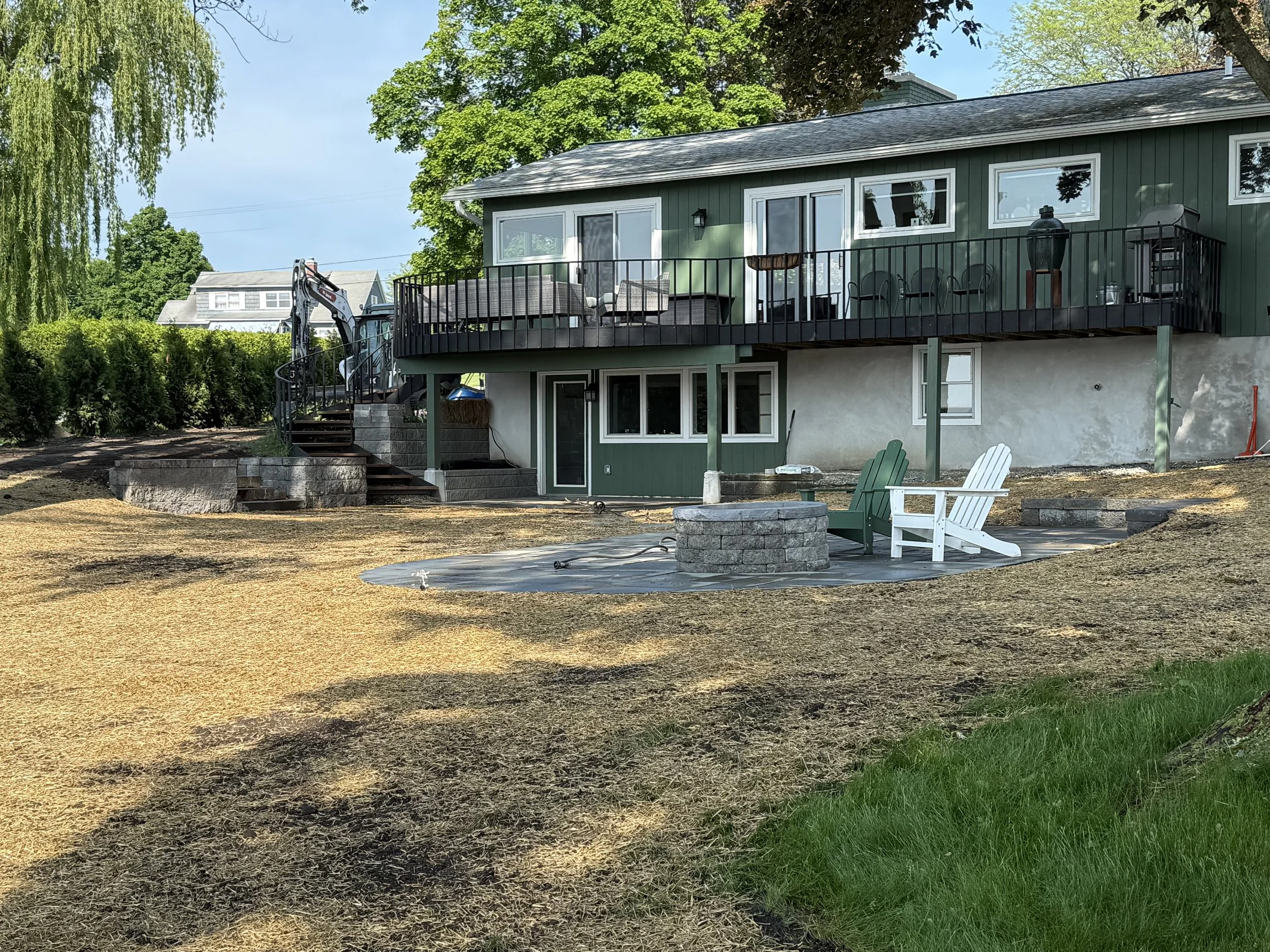 PATIO step & stone wall — Built two small retaining walls with stairs in between, and a large patio and fire pit with a small retaining wall.